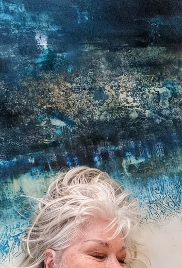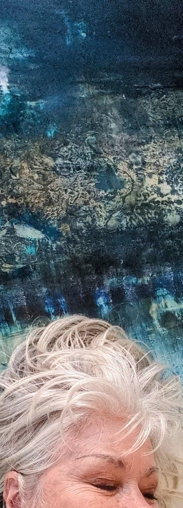 Je vis au bord de la mer. Ses fracas, ses silences ses couleurs me bercent depuis l'enfance. Ses lignes et ses mystères nourrissent depuis toujours mon travail artistique. J'explore les bords du visible, ce qui affleure, se devine et nous relie en profondeur. Mon travail résolument abstrait est traversé par les tensions du clair-obscur. Ce passage de l’ombre à la lumière, l’étude passionnée de ses gradations c’est aussi la métaphore d’un attachement : la transformation de l’être à l’école de la patience par l’approche silencieuse de l’art-thérapie. J'ai longtemps accompagné les autres, dans leurs fragilités, leurs tourments et leurs propres processus créatifs. Cette expérience à profondément nourri mon rapport à l'art. Chaque création naît comme un palimpseste, une strate après l'autre.